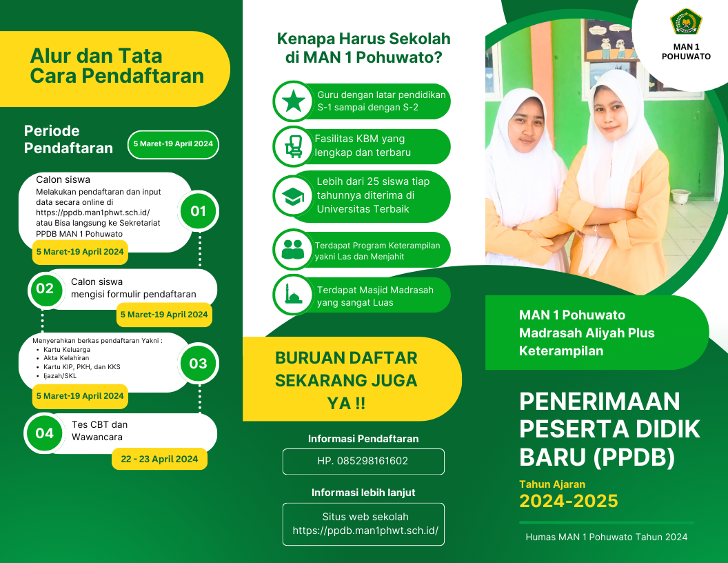 MAN 1 POHUWATO menyediakan PPDB secara online diharapkan proses PPDB dapat berjalan cepat dan bisa dilakukan dimanapun dan kapanpun selama sesi PPDB Online dibuka. Proses pendaftaran calon siswa baru di masa pandemi Covid-19 ini dan terhambat oleh jarak jika datang ke madrasah langsung, bisa mengakses website PPDB Online MAN 1 POHUWATO.